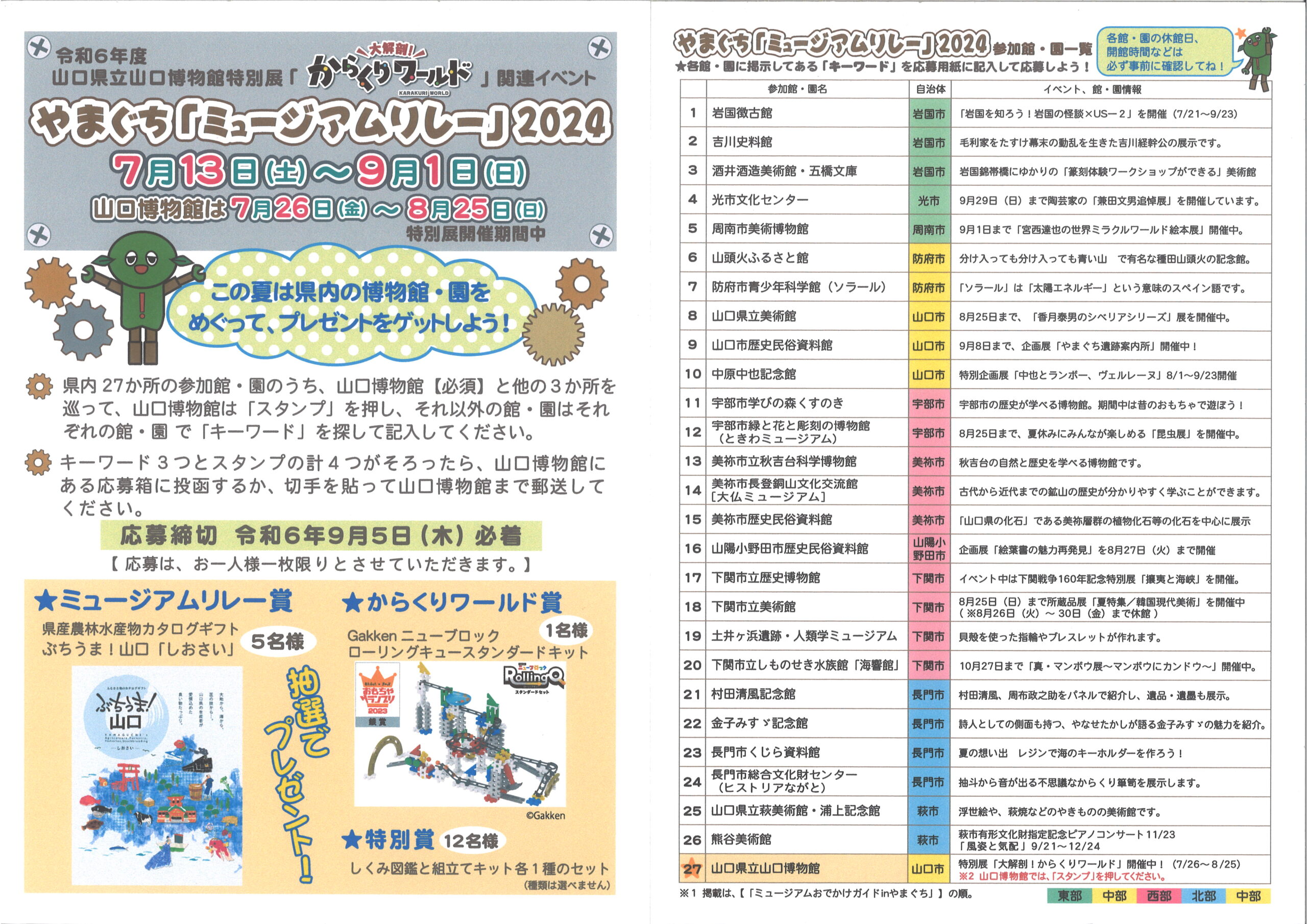 明日7月13日(土)から始まるやまぐち「ミュージアムリレー」2024に吉川史料館も参加します!山口博物館(必須)のスタンプと、その他県内26カ所の中から3か所を巡ってキーワードを探し、専用の応募用紙より応募するとプレゼントが抽選で当たります。当館にもキーワードを設置しますので、ぜひ探してみてください。14日(日)にはギャラリートークも開催いたしますので、是非この機会にご来館下さい!