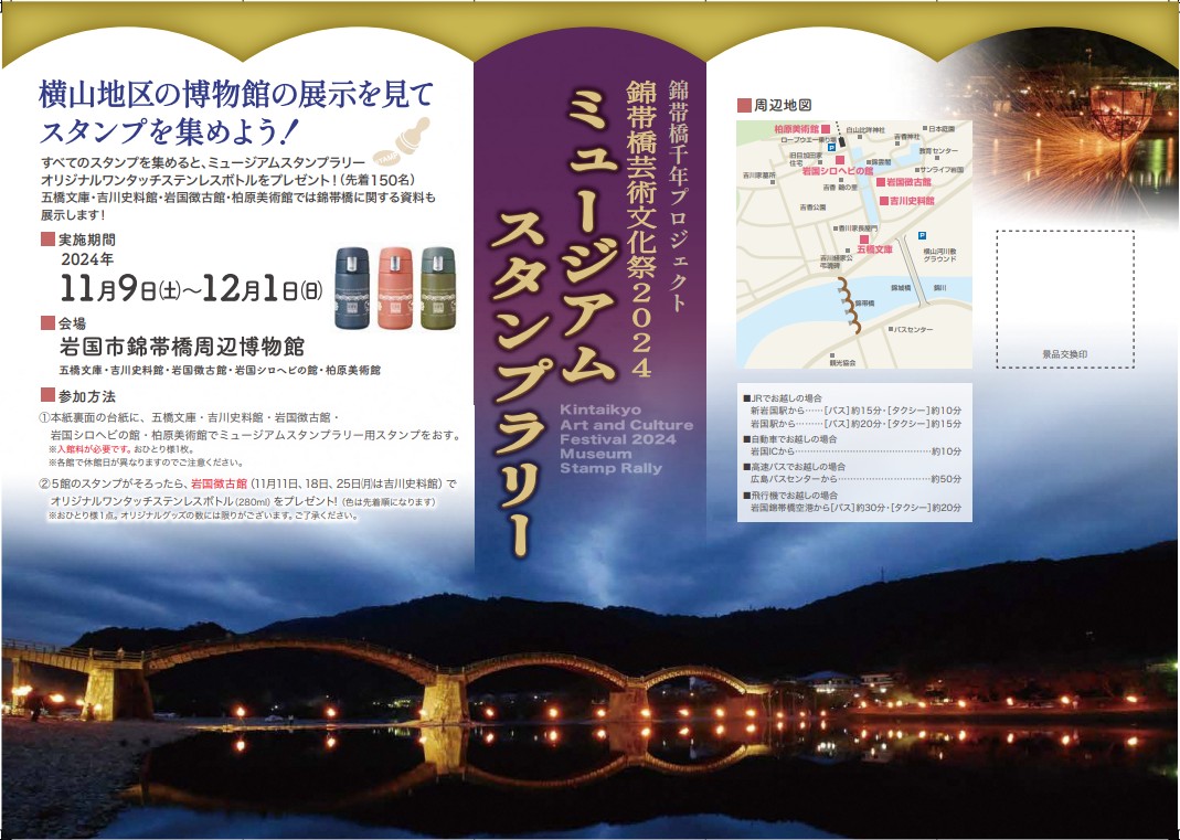 吉川史料館、五橋文庫、岩国徴古館、岩国シロヘビの館、柏原美術館の5つのスタンプを集めた方先着150名にステンレスボトルをプレゼント。