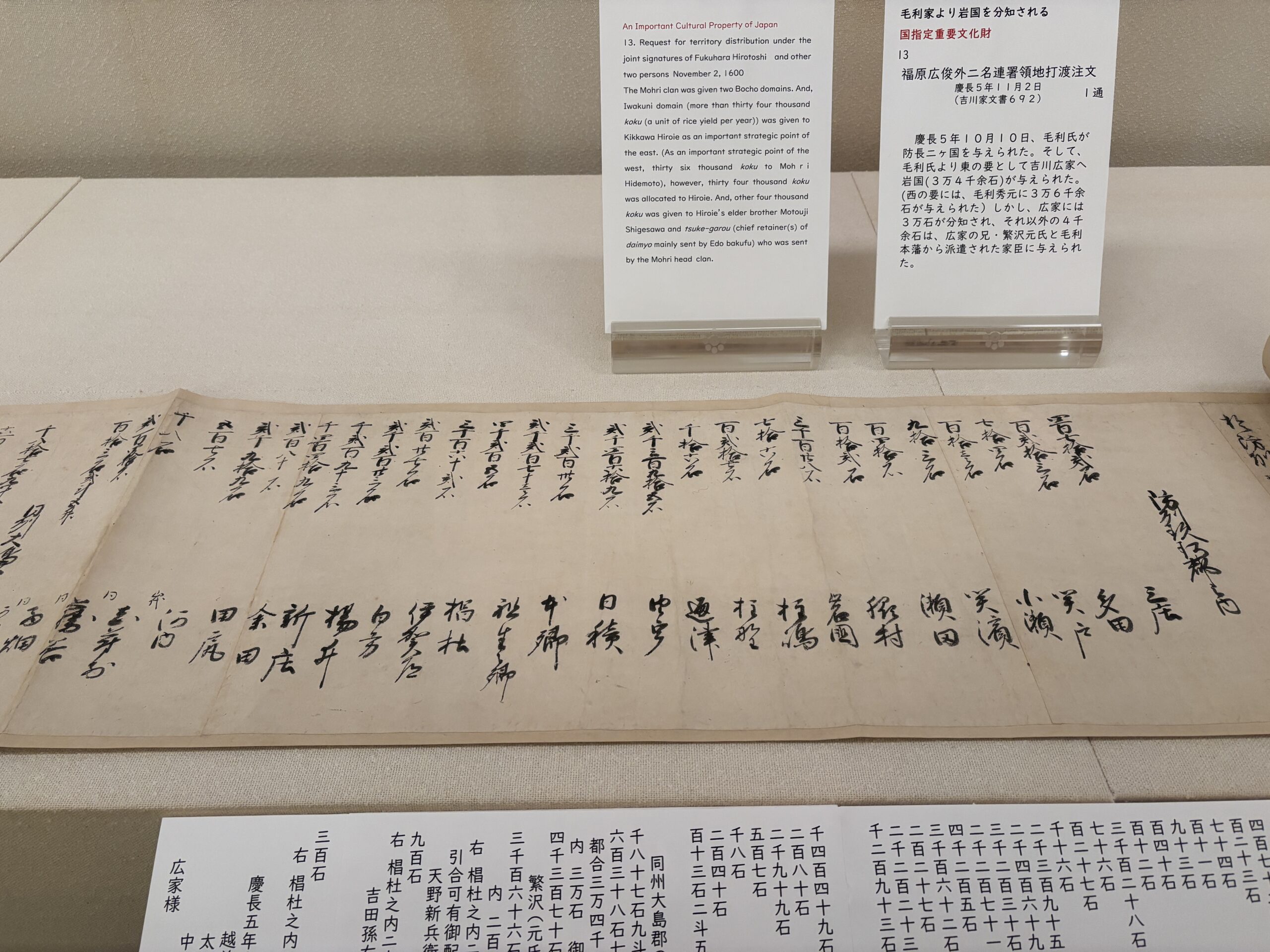 広家公へ渡された防州玖珂郡内の地名とそれぞれの石高が記載されています。この中に「岩国」という地名が含まれています。どこに書いてあるか是非探してみてください。